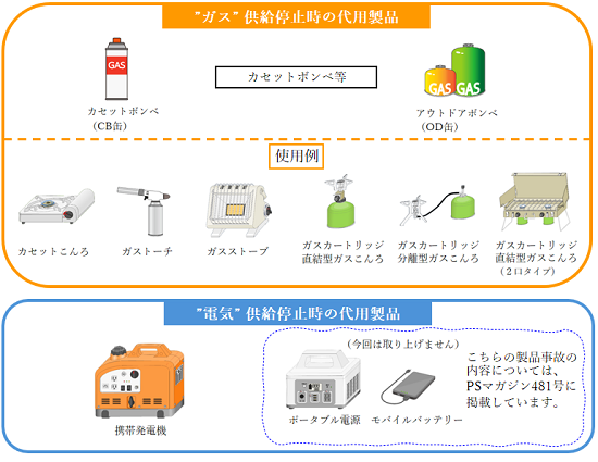 災害時に活躍する製品としては例えば、“ガス”供給が停止した際に代用となるカセットボンベ等(※1)、“電気”供給が停止した際に代用となる携帯発電機やポータブル電源などがあります。