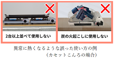 また、避難先としてのテント内や車内など、狭い場所でカセットこんろを使用しないようにしましょう。周囲の可燃物に着火して火災になるおそれがあります。狭い場所で使用すると、不完全燃焼して一酸化炭素(CO)中毒に至るおそれがあり大変危険です。