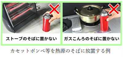 カセットボンベ等を保管する際は、40℃以上の高温下や熱源のそばには放置しないよう気を付けましょう。こんろなどの熱源のそばや直射日光が当たるような場所に放置すると破裂のおそれがあり、大変危険です。