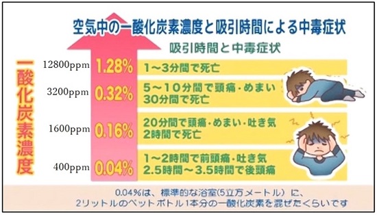 →換気が十分に行えない屋内で使用したため、排気ガスにより屋内の一酸化炭素濃度が上昇し、一酸化炭素中毒になったものと推定されます。