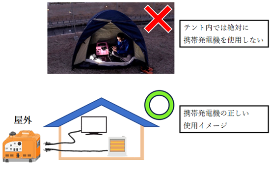 携帯発電機は屋内では絶対に使用せず、屋外の風通しの良い場所で使用する