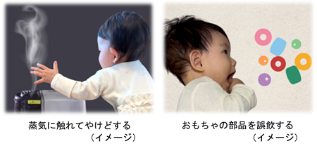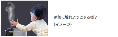 →スチーム式の加湿機能付き空気清浄機を運転中、親が目を離した隙に、こどもが高温になった蒸気口に触れてしまい、やけどを負ったものと考えられます。