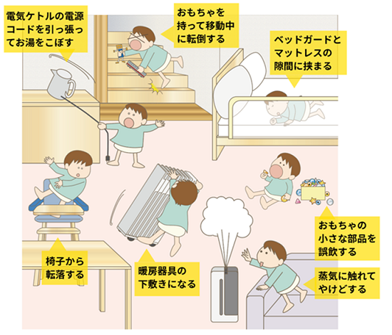 0歳から3歳までの時期は「指で物をつかむ」、「つかまり立ちする」等の運動機能の発達とともにできることが増える時期です。こどもの『できた!』が増えることは喜ばしいことですが、それと同時に事故に遭うリスクのある場面も増加します。
