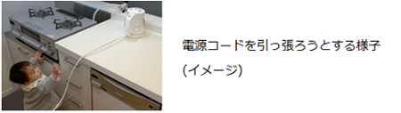 →電源コードをこどもが引っ張ったことにより、高い位置から落下した衝撃で蓋が外れて熱湯がこぼれ、やけどを負ったものと考えられます。
