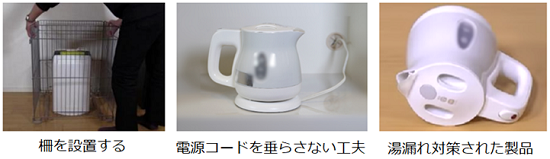 「床に置く製品は周囲に柵を設置する」、「製品は電源コードも含めて高い位置に配置する」、「転倒してもお湯がこぼれにくく対策された製品の使用を検討する」等の、万一目を離した時のための安全な環境づくりが有効です。