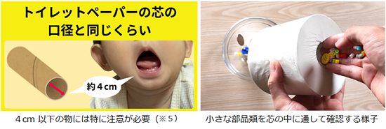 東京都のアンケート調査(※3)では、誤飲事故、ヒヤリ・ハット経験は3歳未満のこどもに集中しています。また、3歳のこどもの口の直径はおよそ4cm(※4)で、ほぼトイレットペーパーの芯の直径と同じ大きさ(※4)と言われています。
