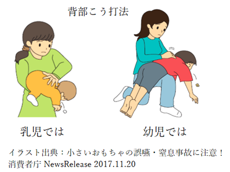 乳児では、口の中に指を入れずに、片腕にうつ伏せに乗せ顔を支えて、頭を低くして、背中の真ん中を平手で何度も連続してたたきます。幼児では、立て膝で太ももがうつ伏せにした子のみぞおちを圧迫するようにして、頭を低くして、背中の真ん中を平手で何度も連続してたたきます。どちらも腹部臓器を傷付けないように、力加減に注意しましょう。