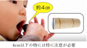 3 歳のこどもの口の直径はおよそ 4cmで、ほぼトイレットペーパーの芯の直径と同じ大きさと言われています(※4)。トイレットペーパーの芯を容易に通過してしまうサイズの物は、すべてこどもが飲み込むリスクがあります。