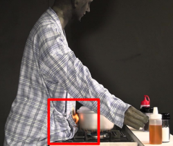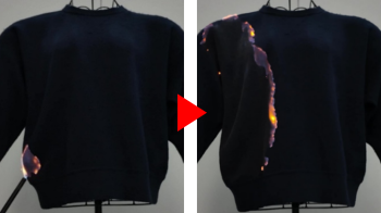 ガスこんろの炎に衣服が接触して着火 着衣着火後、表面フラッシュ現象で炎が広がっている様子