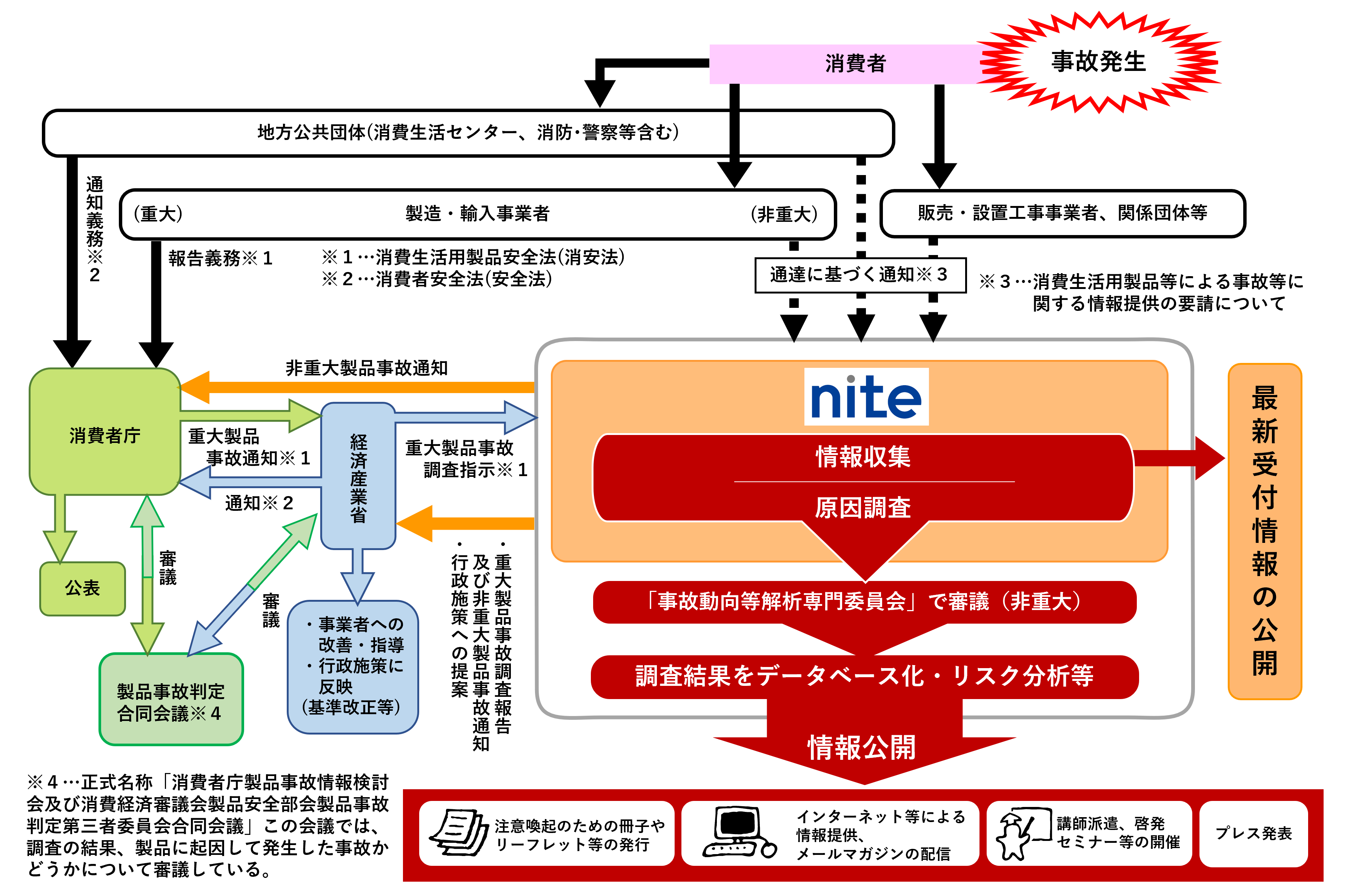 経済産業省の製品安全行政の一環として、昭和49年から暮らしの中で使用される製品によって起こった事故の情報を収集しています。平成19年に消費生活用製品安全法によって、重大製品事故の発生を知った製造・輸入事業者は、国へ事故の情報を報告することが義務づけられ、平成21年からは消費者庁に報告されています。また、重大製品事故以外の製品事故(非重大製品事故)は、NITEが情報収集しています。